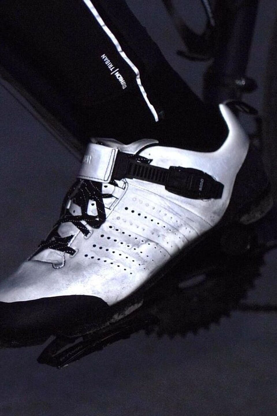 Das Schuhmodell GRVL 520 für Klickpedale von Triban ist vornehmlich für den Einsatz mit Rennrädern und Gravelbikes konzipiert, aber auch Radtouren sind damit möglich. Denn der Schuh ist darauf ausgelegt, trotz steifer Sohle auch Komfort beim Gehen zu bieten. Bei Tag erscheint der Schuh unauffällig grau, bei Dunkelheit ändert sich das umgehend, denn das Obermaterial – und damit fast der gesamte Schuh – reflektiert Licht und macht Fahrer:innen damit besser sichtbar. Der Schuh ist erhältlich für 74,99 Euro bei Decathlon.