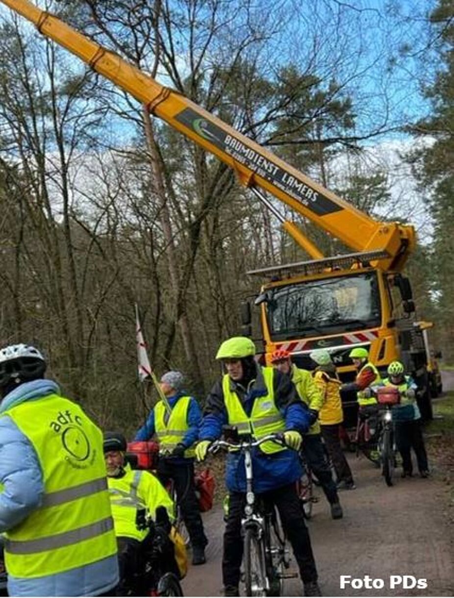 Also ging es von Drevenacks EDEKA-Laden auf zivilisiertem Radweg, der bekannten Trasse, weiter, bis ein riesiges Kranfahrzeug, von dem aus Bäume beschnitten wurden, uns abermals den Weg versperrten. Auch dieses Hindernis haben alle als flexible Pedalisten, die Fahrräder schiebend zu umstapfen gewusst; von “gehen“ konnte nicht die Rede sein, haben uns, so könnte man sagen, „Bahn gebrochen“.