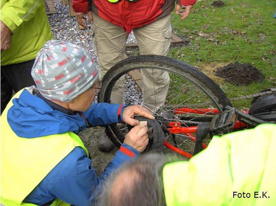 Nach der Pause ging es ein paar Meter weiter, als NN2 rief. „Halt, Panne!“ Das ist zugegebener Maßen fürs Fahrradfahren das Hindernis schlechthin. Wiederholtes Aufpumpen machte nur deutlich: Im Schlauch ist ein Loch. Punkt, Ende. Sechzehn Radler und Radlerinnen, mindestens zehn Lösungsangebote. Des ungeachtet ergriff NN3 die Initiative, holte sein Werkzeug, schritt zu Tat und pappte ein Flicken auf das Loch. Nach 21 Minuten war das Kästchenfahrrad wieder fahrbereit, Panne bewältigt. Am Schloss Raesfeld, zu dem ich ein paar Worte zu sagen hatte, ging es vorbei zum Vennekenhof, wo NN4 die Gruppe inklusiv einiger Grünkohlesser*innen angemeldet hatte. Das war denn auch der Touren-Wendepunkt. Von da aus sollte es wieder gen Heimat gehen.