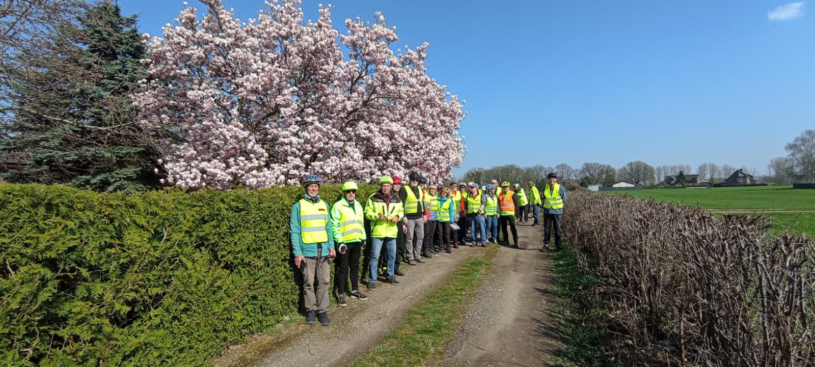 Von Orsoy aus ging es grob westwärts nach Vierbaum. Hier haben wir nach rund 18 Kilometern die erste kleine Pause abgehalten. Als es dann an die Weiterfahrt ging, passierten wir nach wenigen Metern ein Gehöft mit einem äußerst prächtig blühenden Kirschbaum. Das haben wir uns natürlich nicht nehmen lasse, ein Gruppenbild unter diesem Baum zu machen.
