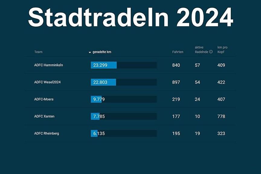 (zel) Stadtradeln 2024 ist Geschichte. Unser Team darf auf ein sehr gutes Ergebnis zurückblicken. 57 aktive Teammitglieder*innen habe 23.299 km erradelt. Damit belegt unser Team im Ranking der 69 teilgenommenen Teams auf kommunaler Ebene (wieder) den ersten Platz. Auch im Wettstreit mit den anderen ADFC Gliederungen im Kreis Wesel hat unser Team die Nase vorn. Knapp 500 km trennen uns vom Zweitplatzierten, dem ADFC Wesel. Im kreisweiten Städtevergleich hat Hamminkeln die 200.000 Kilometer-Marke wieder (knapp) geschafft. Das reichte für Platz 5 aller Kommunen. Die Siegerehrung findet am Mo. 17. Juni um 17 Uhr am Schloss Ringenberg statt.