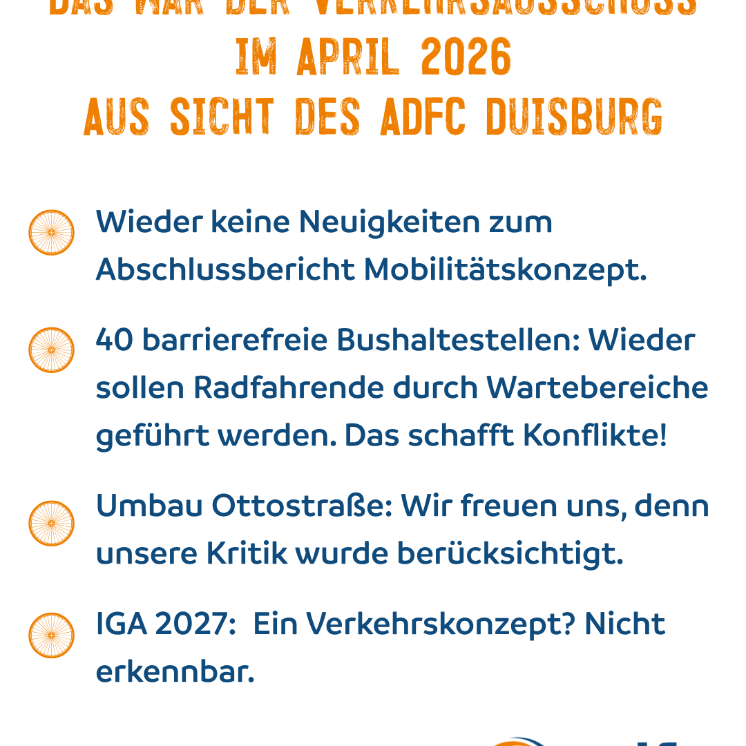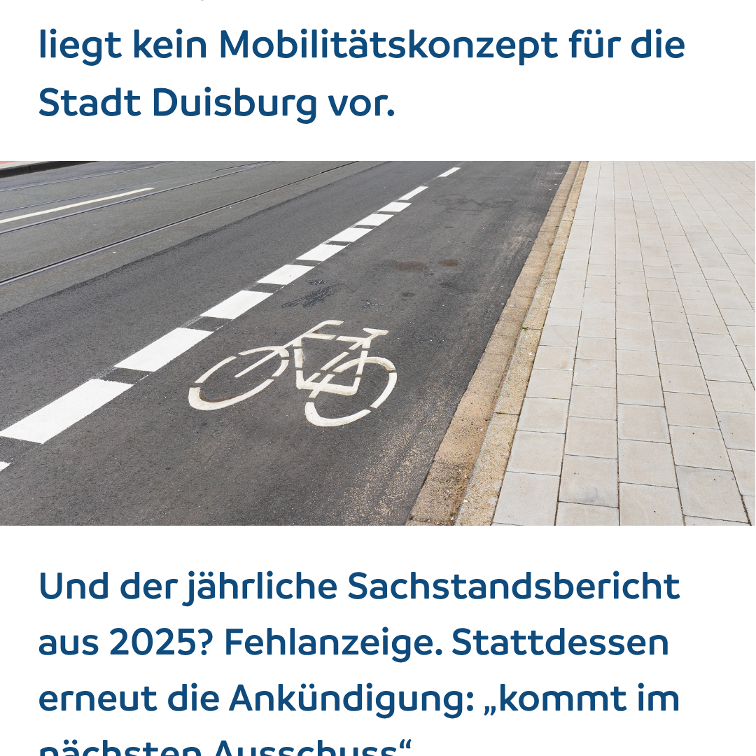 Zum Mobilitätskonzept gab es erneut keinen Sachstand. Dabei ist die Lage eindeutig: Der Rat hatte 2024 beschlossen, aus dem Abschlussbericht ein Handlungskonzept zu entwickeln und jährlich über den Fortschritt zu berichten. Im Ausschuss blieb es erneut bei der Ankündigung, der Bericht komme „in der nächsten Sitzung“. Nach inzwischen 1,5 Jahren ohne Ergebnis ist das nicht akzeptabel. Duisburg fehlt weiterhin die strategische Grundlage für eine moderne Verkehrspolitik.