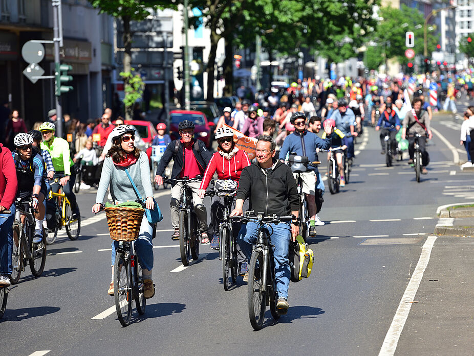 Tausende Radfahrende fahren über Straßen in Düsseldorf und demonstrieren für mehr Fahrradmobilität.